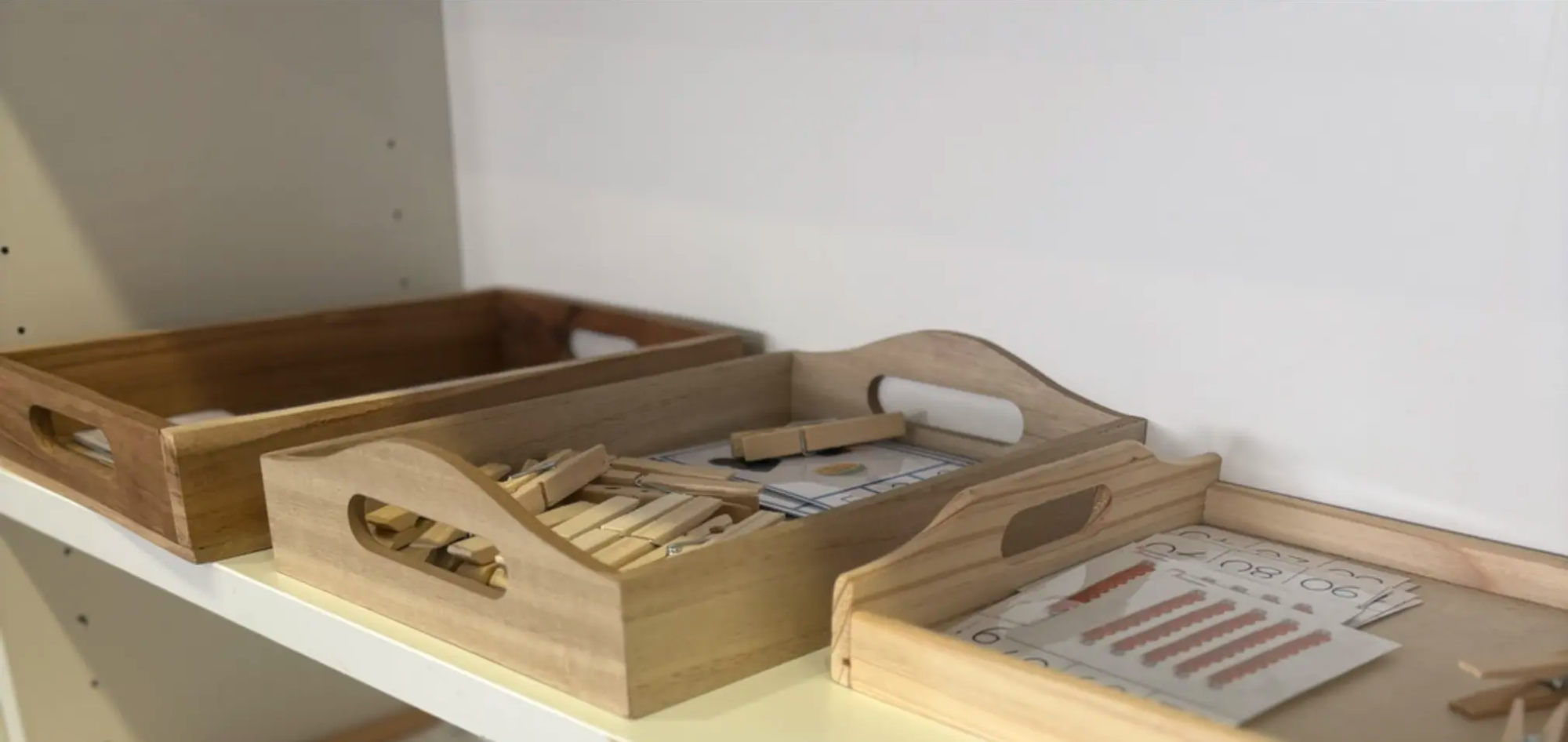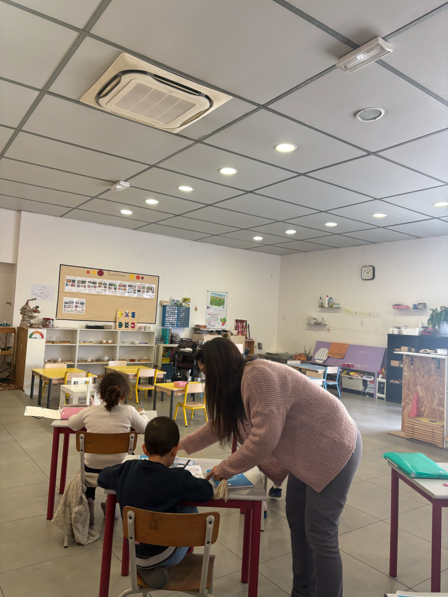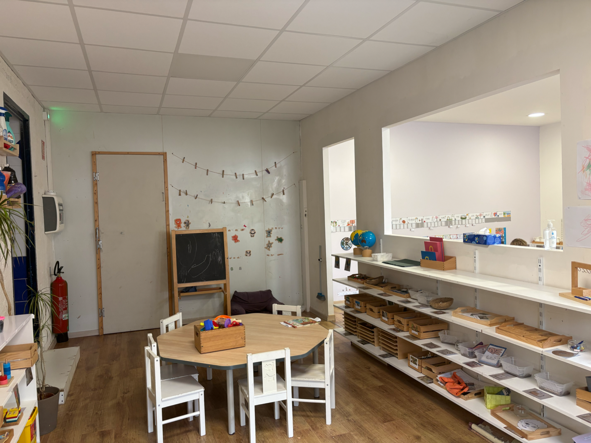 La classe est ordonnée et organisée de façon claire afin de favoriser le repérage et l’autonomie de l’enfant. Elle s’articule autour de différentes aires : vie pratique, vie sensorielle, langage, mathématiques, activités plastiques, sciences (zoologie et botanique) et géographie. Toutes les activités sont rangées de façon ordonnée et selon leur niveau de difficulté.